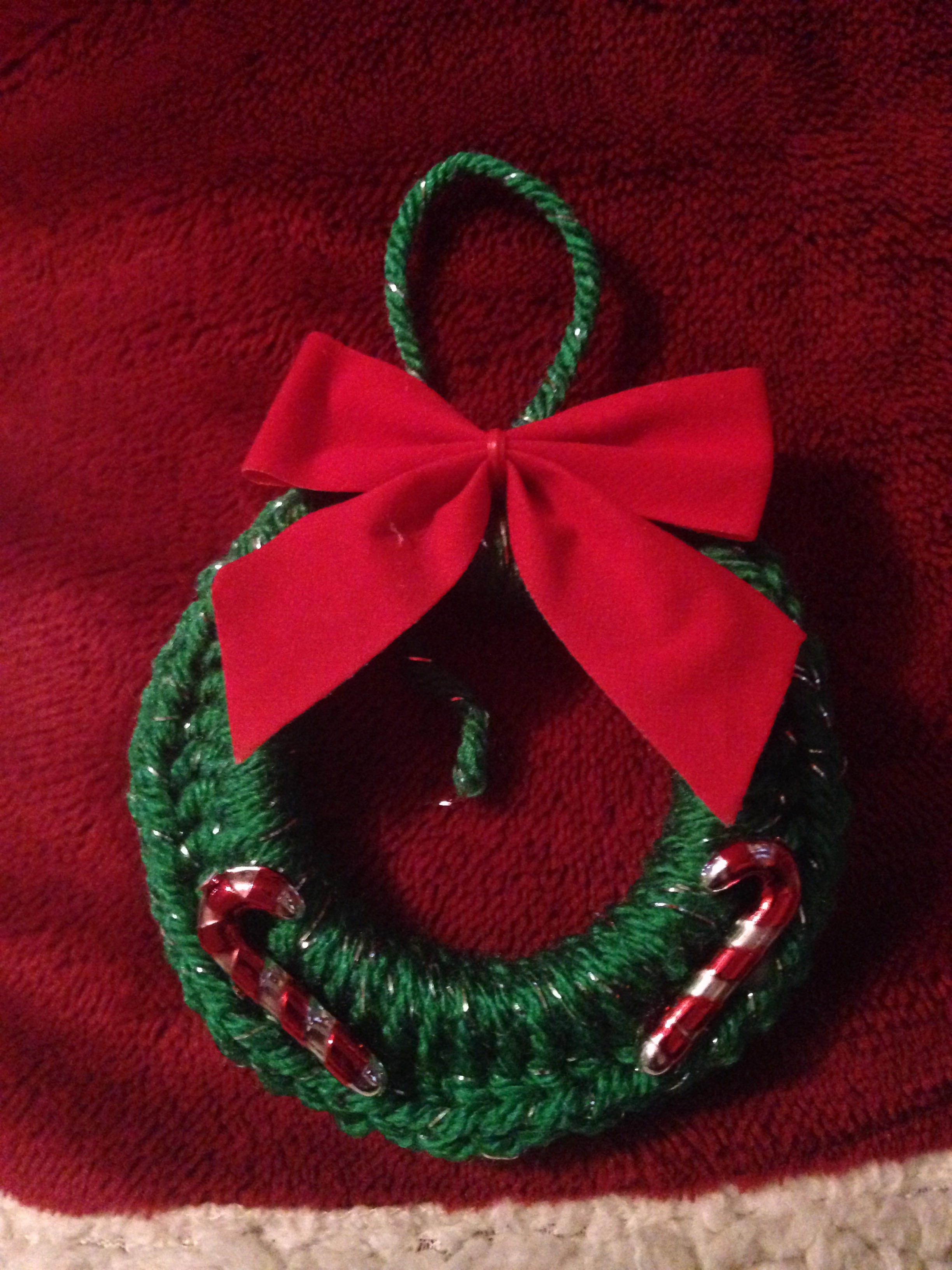I am using this simple shower curtain ring ($1.00 for 12) and crocheting all around it, then adding bows ($1.00 for 18), ornaments ($1.00 for 10) and a yarn ribbon (scrap yarn) to create this